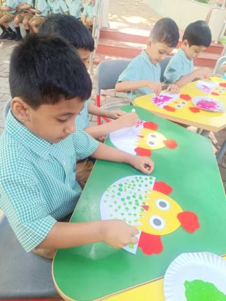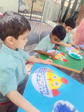 In Lower Kindergarten, the children explored earbud printing, carefully creating delicate textures on their chicks’ eggs—a beautiful reflection of their growing precision and creativity.