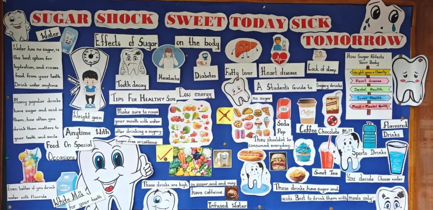 The display board highlights the harmful effects of excess sugar, including tooth decay, weight gain, diabetes, heart disease, and low energy. It encourages choosing water, milk, and infused water over sugary drinks like soda, coffee, and sports drinks, and advises limiting such beverages to special occasions. The message promotes moderation and healthier choices for better health and well-being.