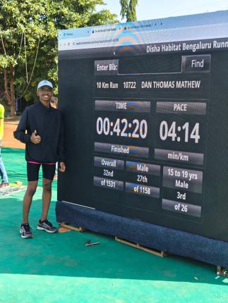 We are proud to share that Dan Thomas Mathew of Class 12E secured third place in his category at the Bengaluru Jatra Marathon 2025, completing the 10 km run with an impressive timing of 42.20 minutes.