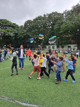 Wide-eyed wonder followed with the enchanting puppet show of The Three Little Pigs, where the tiny audience watched in rapt attention, giggling and learning through the playful storytelling. But the moment that truly stole the show was the bubble extravaganza—shiny, rainbow-tinted bubbles floated across the air, and the children leapt, twirled, and squealed with delight as they tried to catch and pop them. The air was filled with peals of laughter, as bright and magical as the bubbles themselves.
