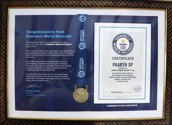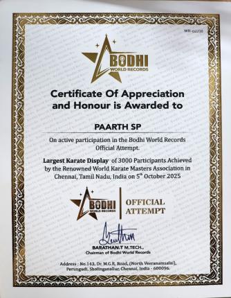 In addition, Paarth SP was awarded a Certificate of Appreciation and Honour for his active participation in an official attempt recognised by Bodhi World Records. These achievements reflect his dedication, enthusiasm, and passion for excellence, making him a source of pride and inspiration at a young age.