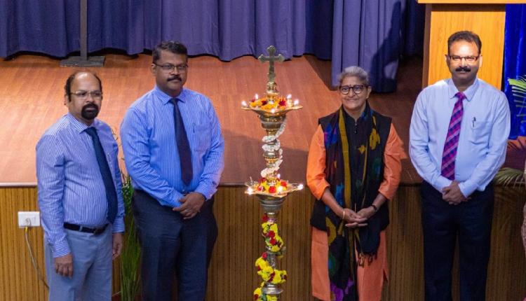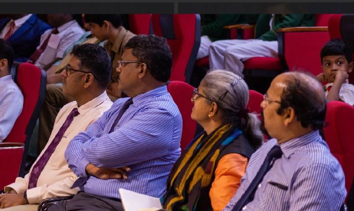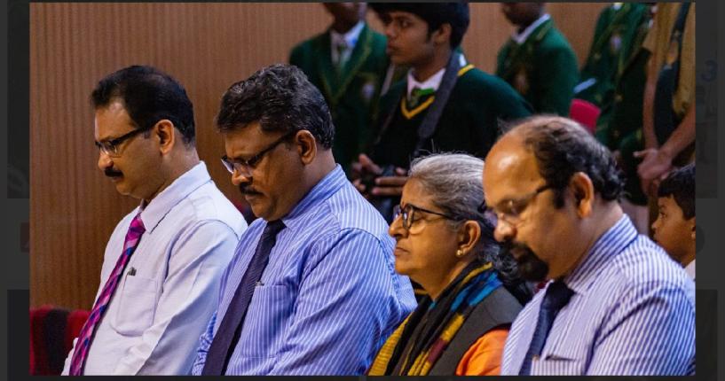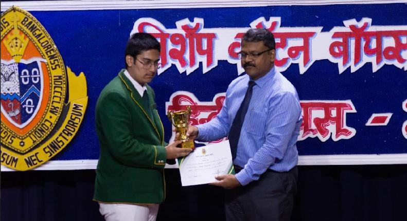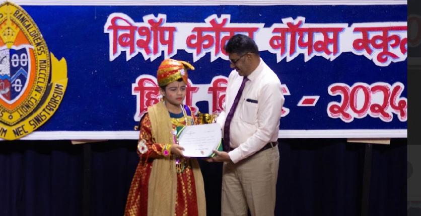 The programme began with a cheerful presentation of Hindi vowels by the Kindergarten children, followed by compering by Daksh A. Singhvi. The Middle School choir rendered the School Song, after which the significance of Hindi Diwas was shared. A Bible reading by Mrs. Roopa and a prayer by Mr. Ganesh Babu preceded the traditional lighting of the lamp by the dignitaries.